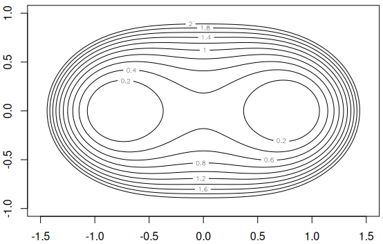 # Inițializează o "fereastră grafică" și parametrii a, b plot(0, type="n", xlim = c(-1.5, 1.5), ylim = c(-1, 1)) a <- 0.8; b <- 0.48 # ... mai mici ca 1 (!) # Constituie o rețea de puncte (x, y), de exemplu cu pasul (orizontal, vertical) 0.01 X <- seq(-1.5, 1.5, by = 0.01) # vreo 300 de abscise, din sutime în sutime Y <- seq(-1, 1, by = 0.01) # vreo 200 de ordonate # Calculează F(x,y) pe fiecare punct (x,y) al rețelei Z <- outer(X, Y, function(x,y) { a^4-b^4-2*a^2*x^2+x^4+2*a^2*y^2+2*x^2*y^2+y^4} ) # Z = F(x,y) # Trasează curbele de ecuații Z = F(x,y) ∈ {0.2, 0.4, 0.6,..., 2} contour(X, Y, Z, levels = seq(2, 20, by=2) / 10)