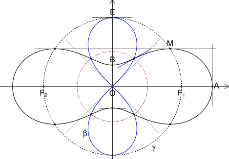 —$(\boldsymbol{l3})$ Curba colorată "blue" și etichetată cu $\boldsymbol\beta$ este o lemniscată Bernoulli, cu focarele $G_{1,2}=\pm\left(0,\,\dfrac{a}{\sqrt{2}}\right)$ și conține punctele de inflexiune ale tuturor cassinienelor omofocale din $(l1)$ (dar pe figură am redat o singură curbă $\boldsymbol\Gamma$; am marcat inflexiunile prin puncte roșii ceva mai mari și am dus o bucată de tangentă la $\boldsymbol\Gamma$, într-unul dintre punctele sale de inflexiune; am trasat și bisectoarele sistemului de axe, care sunt tangente lemniscatei în vârful acesteia).