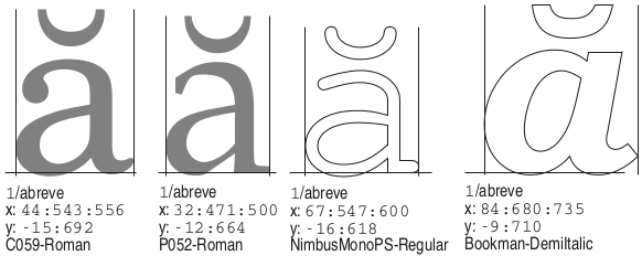Exerciţiu de catalogare (într-un fişier PDF) a fonturilor PS de bază (prin graficele şi metricile asociate caracterelor).