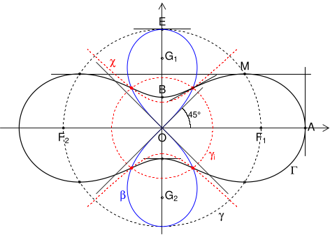 —$(\boldsymbol{l3})$ Curba colorată "blue" și etichetată cu $\boldsymbol\beta$ este o lemniscată Bernoulli, cu focarele $G_{1,2}=\pm\left(0,\,\dfrac{a}{\sqrt{2}}\right)$ și conține punctele de inflexiune ale tuturor cassinienelor omofocale din $(l1)$ (dar pe figură am redat o singură curbă $\boldsymbol\Gamma$; am marcat inflexiunile prin puncte roșii ceva mai mari și am dus o bucată de tangentă la $\boldsymbol\Gamma$, într-unul dintre punctele sale de inflexiune; am trasat și bisectoarele sistemului de axe, care sunt tangente lemniscatei în vârful acesteia).