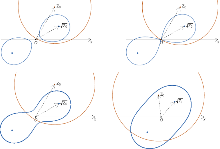Figura a fost produsă experimentând (cu un program pe care îl omitem aici) cu valori mici pentru centrul și raza cercului; oricum ar fi (ca "reușită"), ea ne-ar spune că forma curbei $\Gamma$ rezultate ca "radicalul cercului", depinde de poziția față de polul $O$: dacă $O$ este exterior cercului, atunci $\Gamma$ este formată din două ovale convexe disjuncte (cazul $b\lt a$, v. [3]-II); dacă $O$ se află pe cerc, $\Gamma$ este o lemniscată Bernoulli ($a=b$); iar dacă $O$ este interior cercului, atunci $\Gamma$ este un oval Cassini obișnuit (cazurile $a \lt b \lt a\sqrt{2\,}$ și $b \ge a\sqrt{2\,}$, reprezentate respectiv pe al doilea rând al figurii).