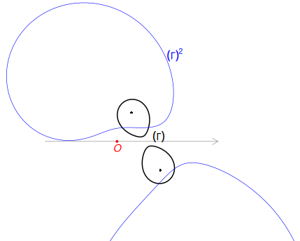 Acum, $\sqrt{K\,}$ (cu radical față de polul $O$) dă curba $\Gamma$, dar nu în poziția corectă: curba roșie rezultată (v. mai jos imaginea din stânga) nu se suprapune peste $\Gamma$ trasată cu negru. Deci trebuie ca în final să translatăm $\sqrt{K\,}$ cu vectorul $mj$ — și atunci obținem (în dreapta) figura corectă, în care "radicalul" translatat al cercului se suprapune lui $\Gamma$ (care din negru, devine roșu):