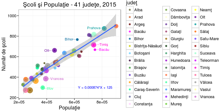 ggtitle("Şcoli şi Populaţie - 41 judeţe, 2015")