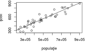 > jud41 <- subset(jud42, cod != 40) > with(jud41, plot(şcoli ~ populaţie)) > with(jud41, cor(şcoli, populaţie)) [1] 0.9324982 coeficientul de corelaţie > linie <- with(jud41, lm(şcoli ~ populaţie)) Coefficients: 1.247e+02 8.744e-04 dreapta de regresie: Y = 0.00087*X + 125 > abline(linie) # adaugă dreapta pe scatterplot