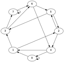 Imaginea alăturată reprezintă graful $\mathbb{B}_3$ (după invocarea dot -Tpng -Kcirco bruijn-3.png bruijn.dot); iată două rezultate de execuţie a programului: